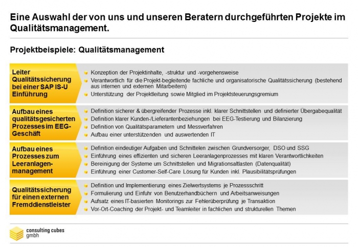 Im Fokus unseres Angebotes liegen Qualitätsmanagement und Qualitätssicherung in großen Projekten sowie effiziente Steuerung komplexer Prozesse, die zu Teilen an Fremddienstleister ausgelagert sind.